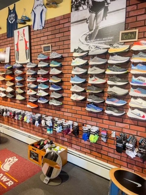 The beautiful and bright sneaker wall at Bryn Mawr Running Co. in Bryn Mawr, PA.