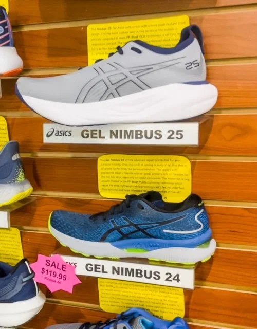 This is my shoe wall at The Running Place in Newtown Square. I have a neutral foot but most of the population requires a support shoe. Do you know what kind of shoe you need?