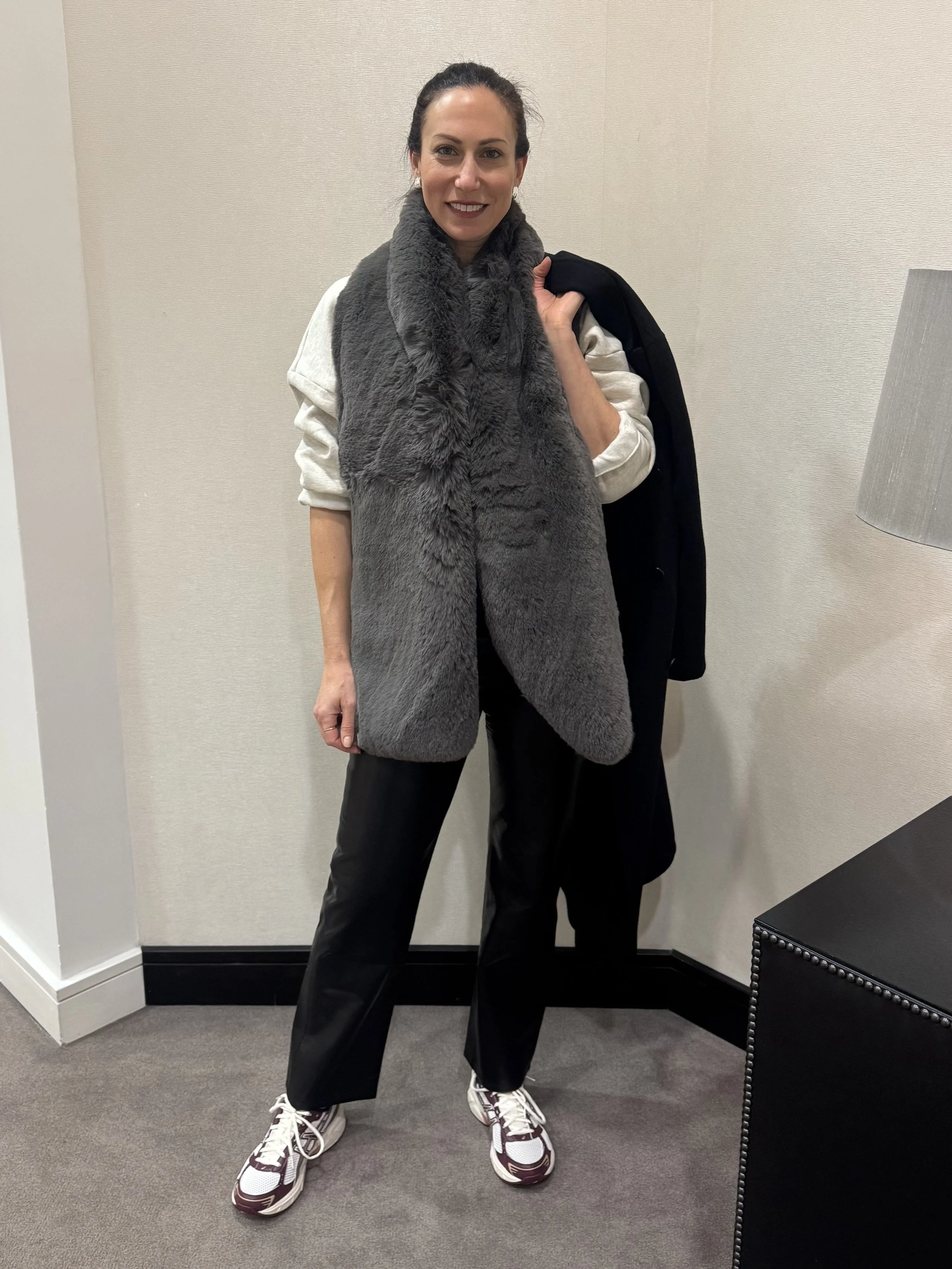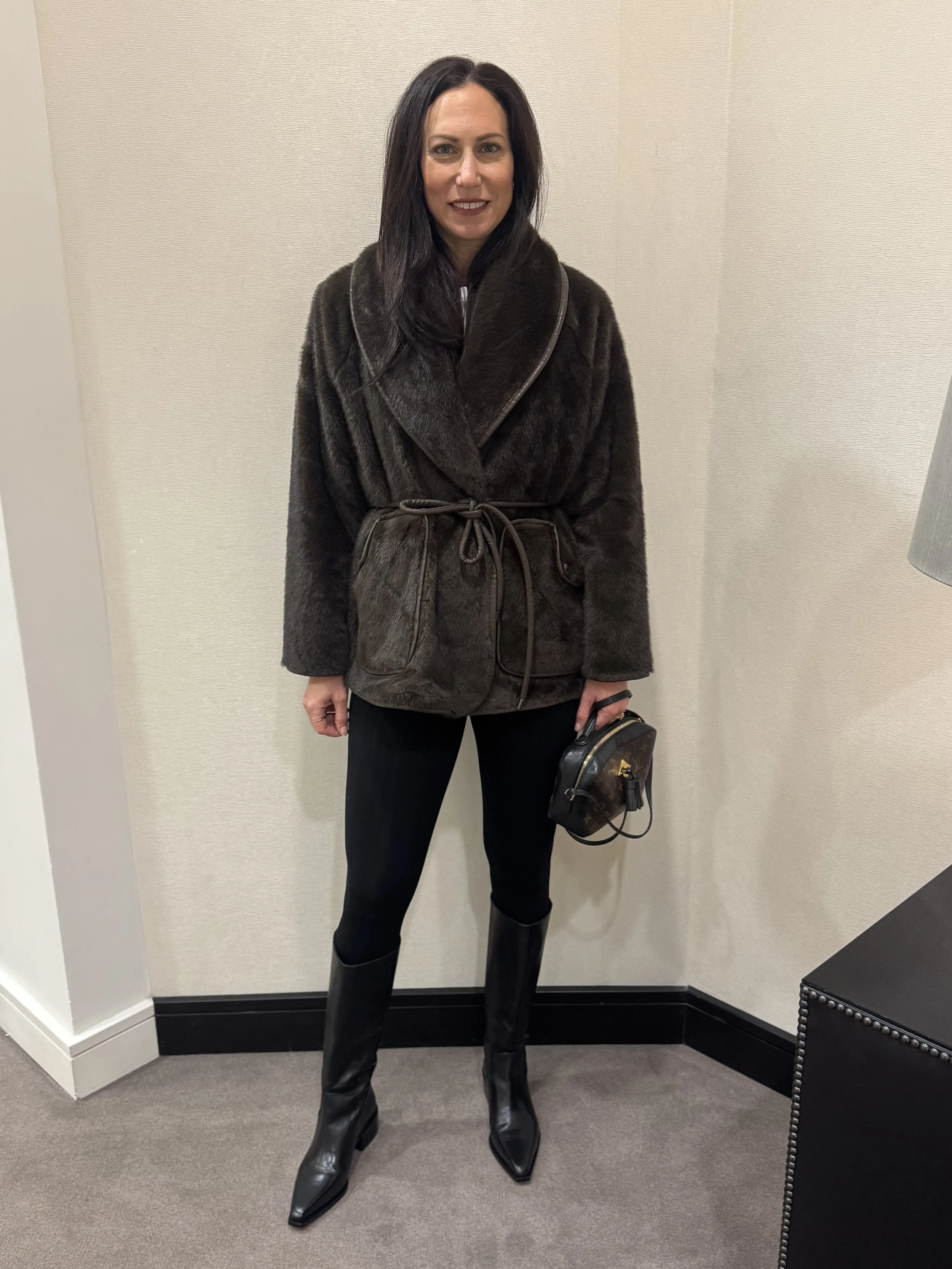 Faux fur is a must-have fashion accessory right now. The dressier fur top with the more casual legging bottom makes this look interesting and unexpected. We paired it with my tall boots to break up the leg.