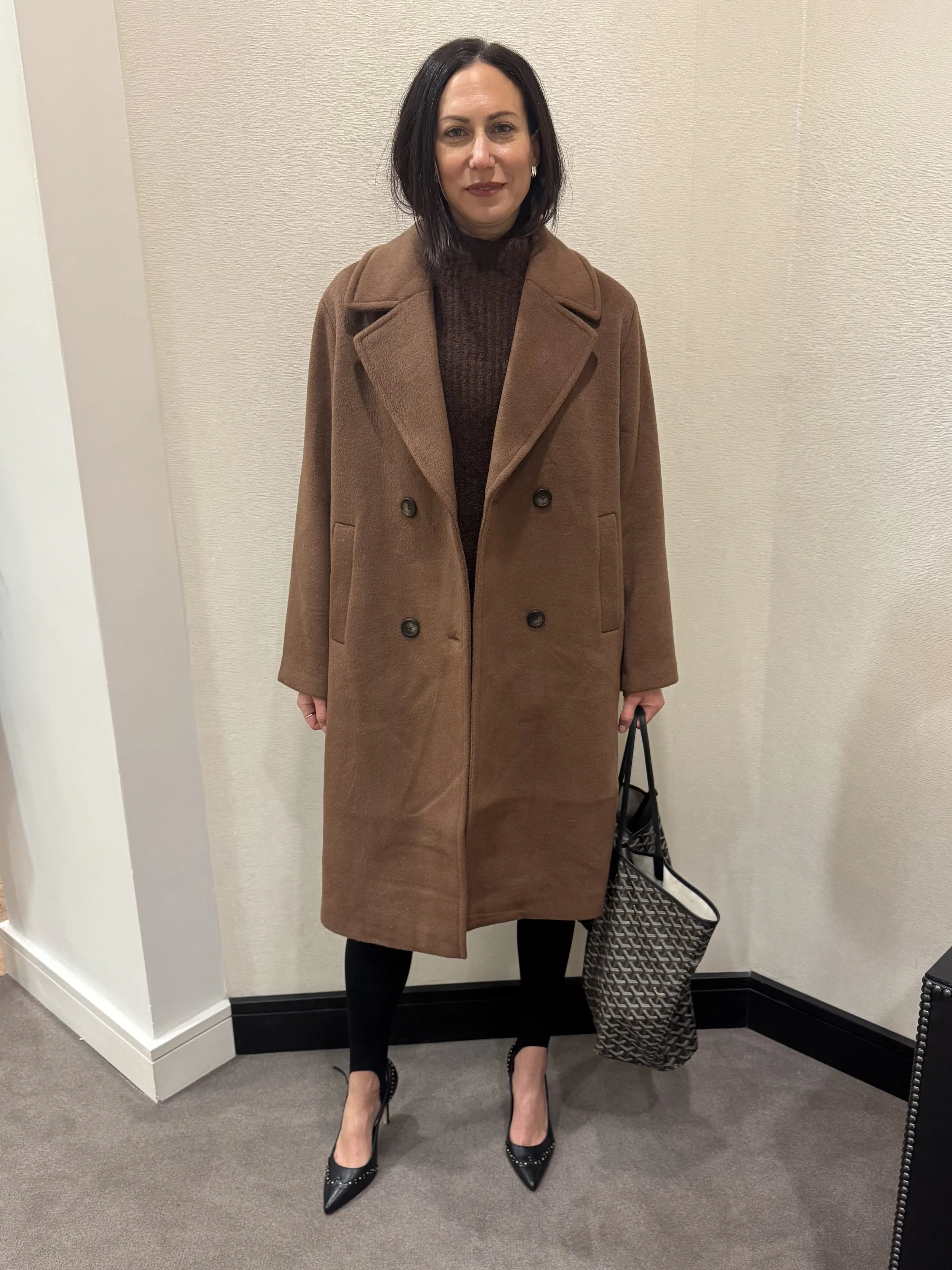 The beauty of this look is the visible stirrup legging with the heel. It’s sexy and chic and takes a simple black legging to a whole other level. This stunning wool coat (you guessed it) that’s on sale and the funnel neck sweater that’s under $100 also add to the sheer beauty of this look.