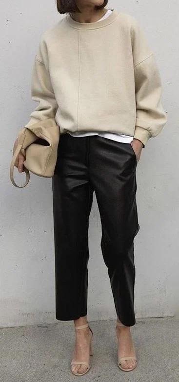 If you want to go from the gym to the streets, a simple but stylish transition tip is to swap your leggings for leather pants. You can keep the sneakers and the crewneck fleece and be fashionably ready for whatever the day has in store for you.