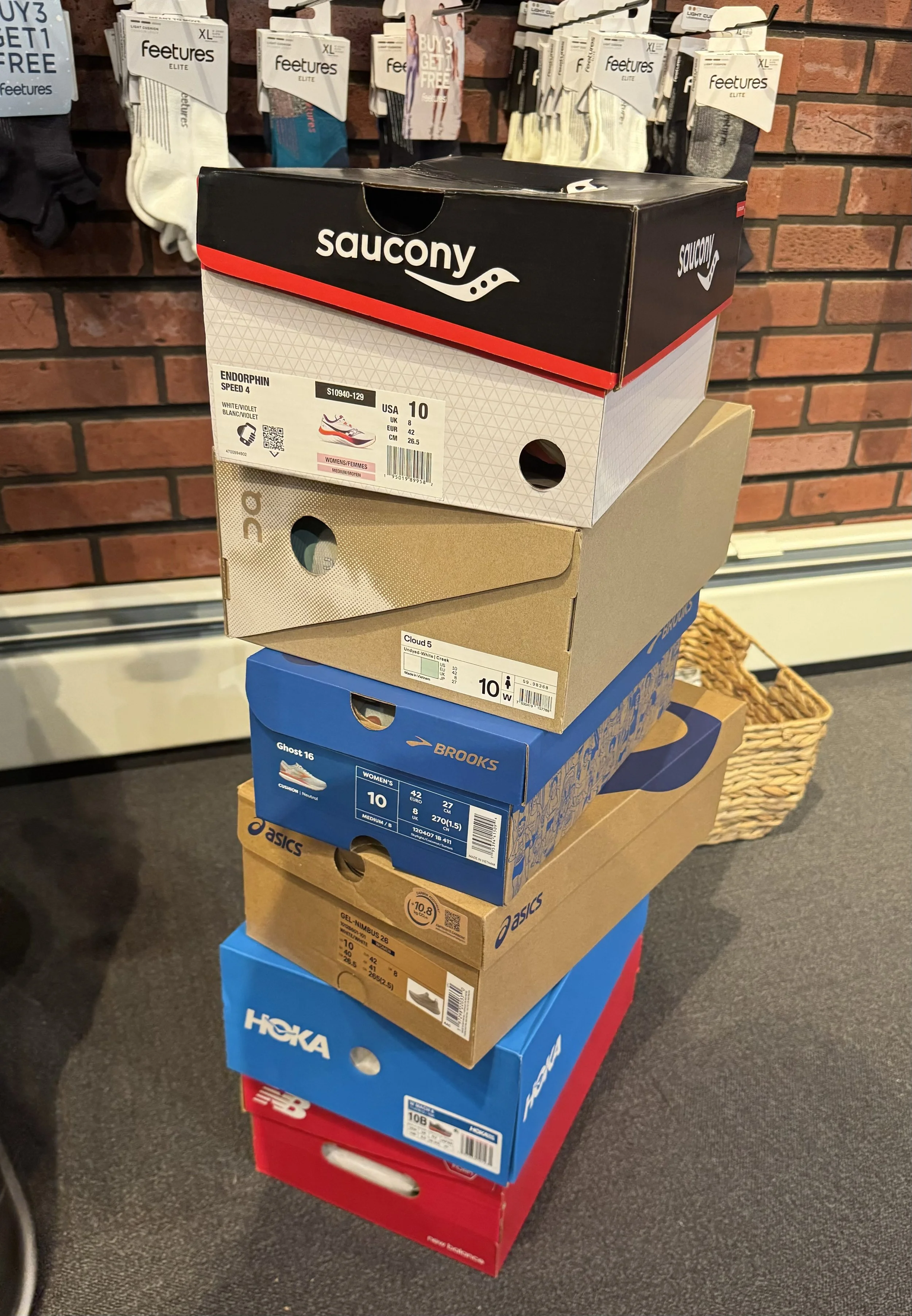 I put on eight of the most popular and well-rounded sneakers in the store. Since I wasn’t shopping for any race in particular, I wanted to try the shoes that most people would want to know about. I admired them. I walked around in them. I ran on the treadmill in each pair. And I asked Wesley for all the deets. So here goes.