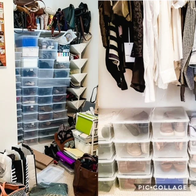 The picture on the left shows what I was doing all wrong with the right product. Obviously, I couldn’t get to any of my shoes. Devin stacked the clear shoe boxes only 4 boxes high and it has made such a difference. Mind blown!