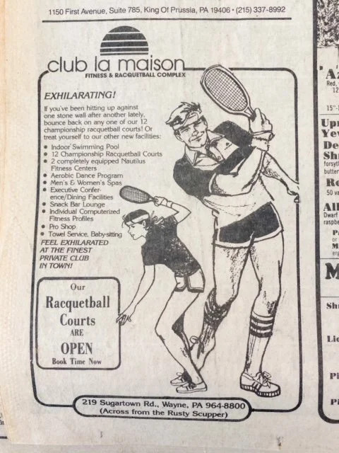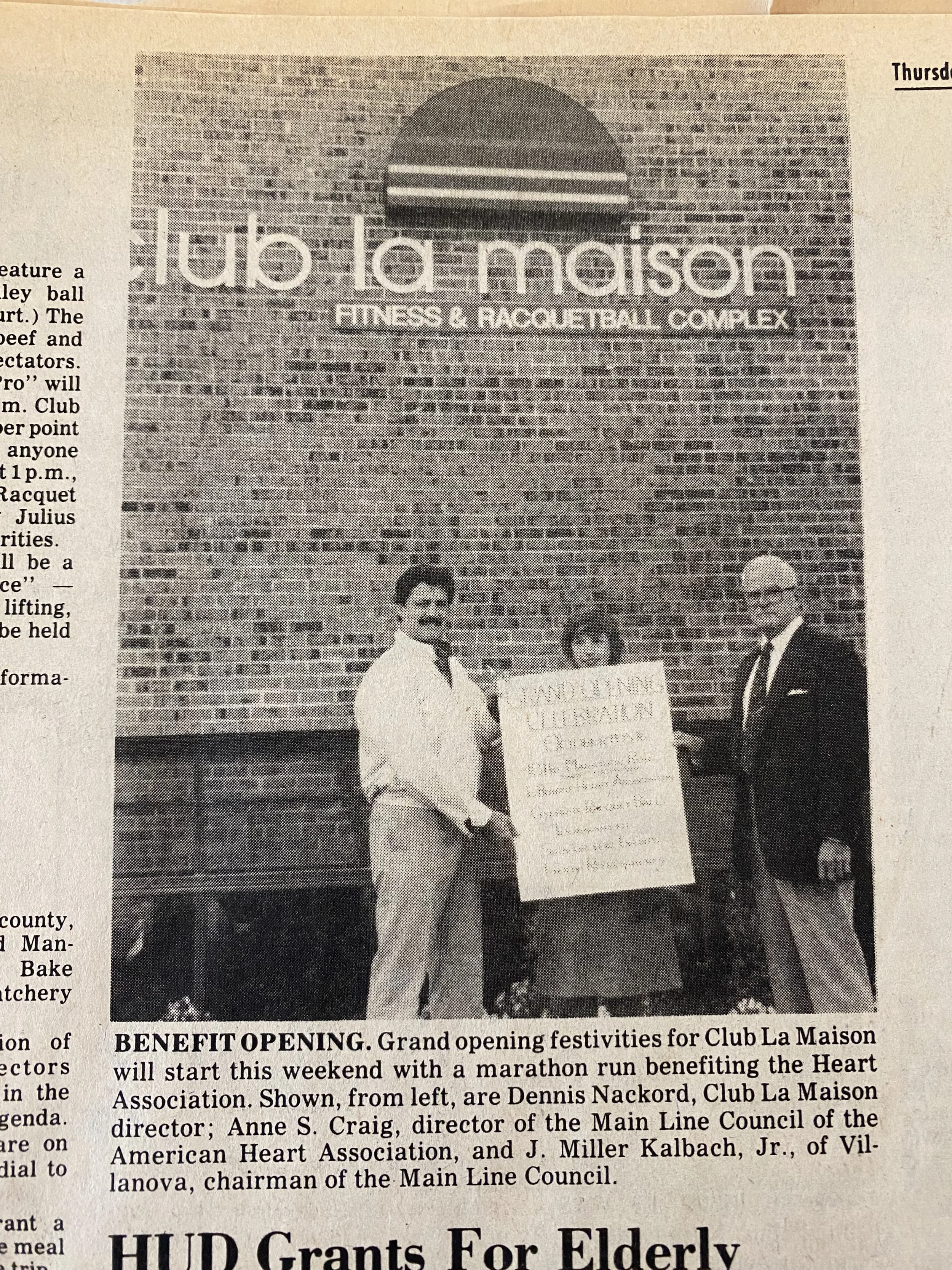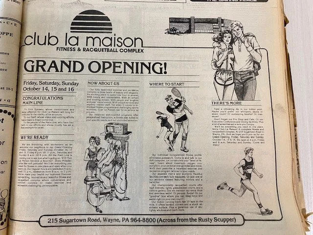 Club La Maison (as it was called for 39 years, losing the “club” in the title just last year) was the first fitness center of its kind. There weren’t any places like it in the area, let alone the country! It was more of a lifestyle center combining fitness with sport and leisure, community with recreation, and social gathering with full service pampering and “self care”, as we like to call it today. La Maison was the place to be in 1983. Anyone who was anyone on the Main Line joined this new, state of the art, one-of-a-kind fitness center. In 1983, the three story building on the corner of Sugartown Road and Morris Road was home to twelve racquetball courts, an indoor swimming pool, an aerobic studio, two spas, a cafe, a floor of Nautilus gym equipment, an indoor track, and separate men and women’s fitness areas. Back in 1983, La Maison was the template for future full service health clubs.