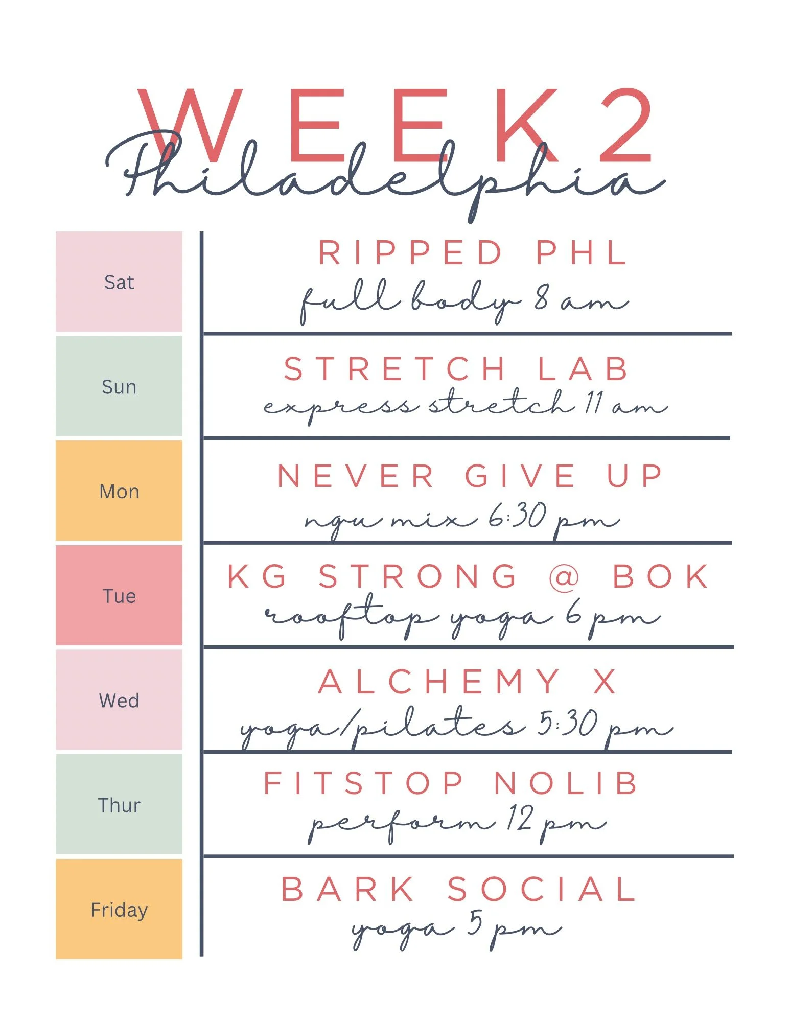 It’s days away, and I am so pumped for this June. For those of you who don’t already know about my June Studio Tour, I spend every day in June going to a different studio. That’s 30 days of 30 different workouts. I used to do my tour only on the Main Line, but last year I added Philly and the shore, and I decided to do that again. And I am even adding a fourth territory to the tour- the Philly area suburbs. I love to get this community involved so I am sharing my schedule in advance in hopes that some of you can join me along the way. I’ll share any special deals and discounts here to entice you even more to workout with me in June. Because having friendly faces in class always makes the workout better!