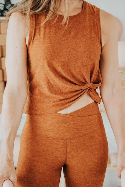 I am actually happy the crop top in this set didn’t work for me because it forced me to look at… gasp… a tank top! I need some tank tops in my life anyway. I can’t always be wearing a crop (although this tank does show a little skin on me because of my long torso). And the cute twist in the front spices up this simple tank.