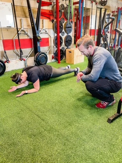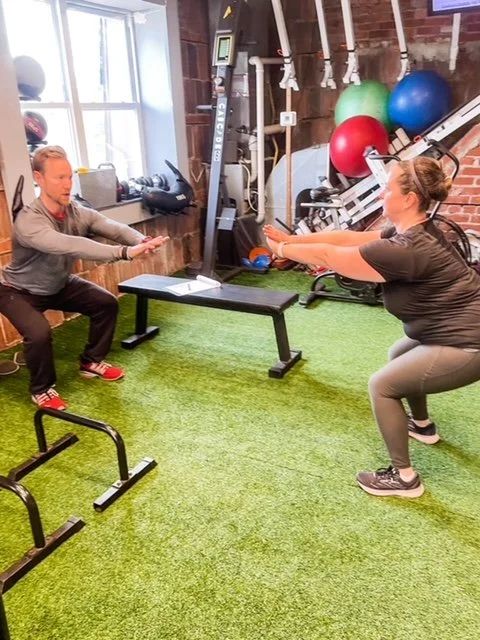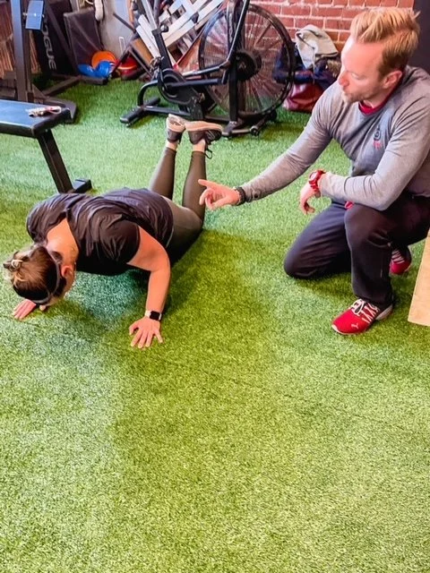 Bill then walked Liz through a list of exercises that she might see in a workout (i.e., deadlift, squat, pushup, pull-up, plank, split squat, lunge). With each exercise Bill watched Liz and offered an appropriate form adjustment or modification. For example, he used a PVC pipe to hinge forward and show Liz how she should feel when doing a proper deadlift. With the push-up, he offered several modifications and a progression of movements for Liz to work towards. Bill also gave Liz substitutions for any exercise that she couldn’t do because of an injury.