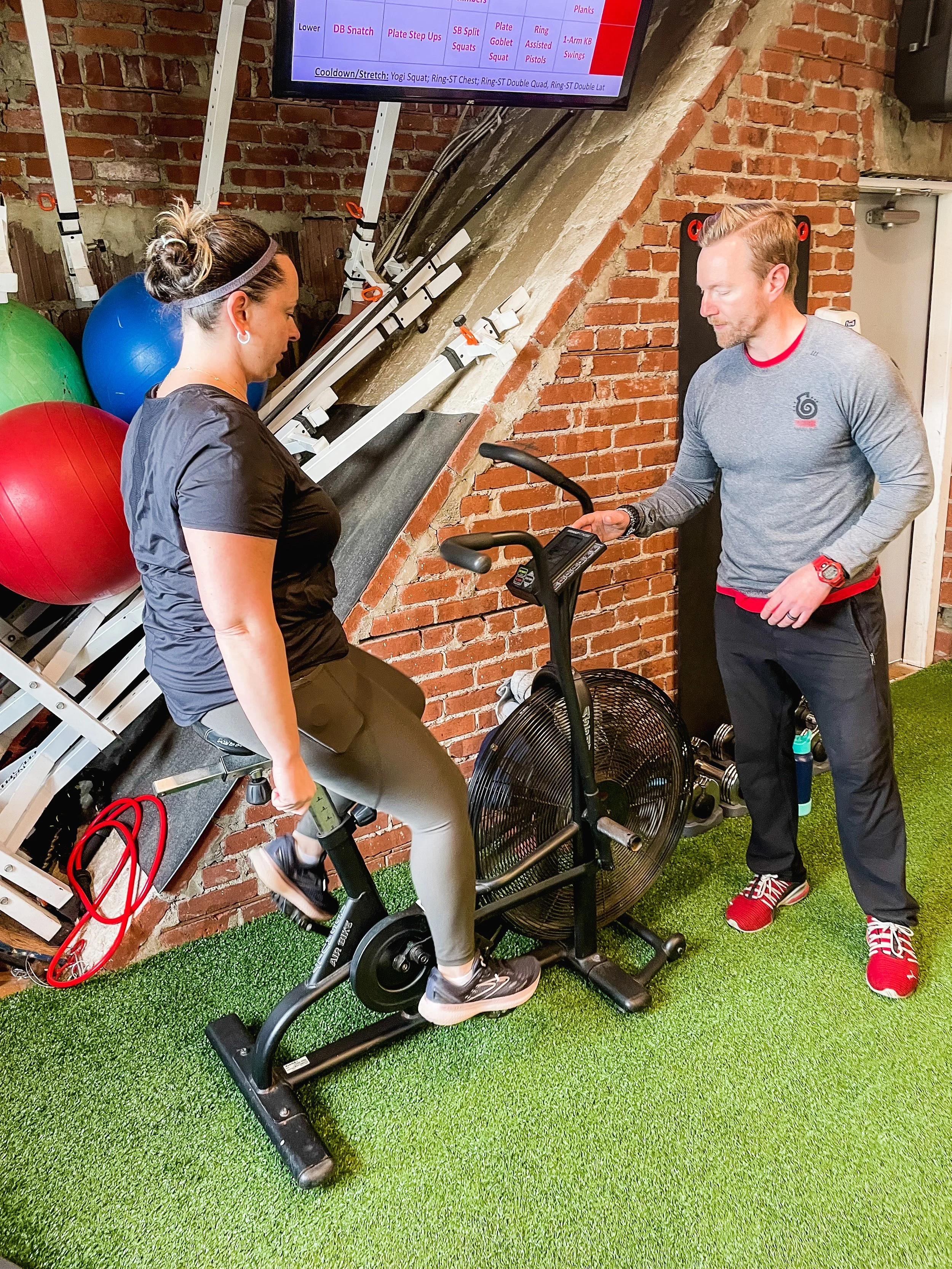 Bill first showed Liz the cardio equipment, like the assault bike and the skier. He had her run through a typical cardio segment.