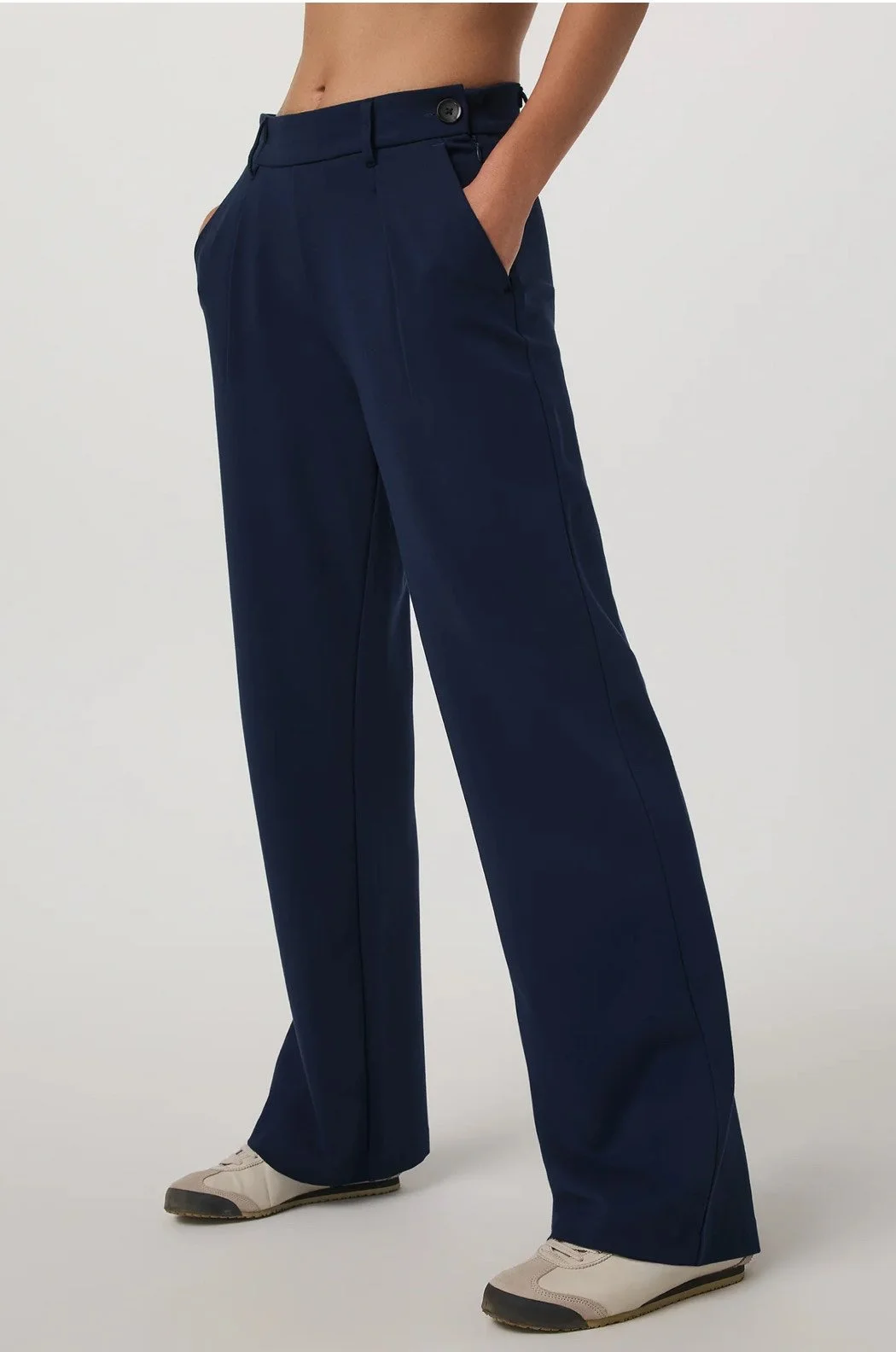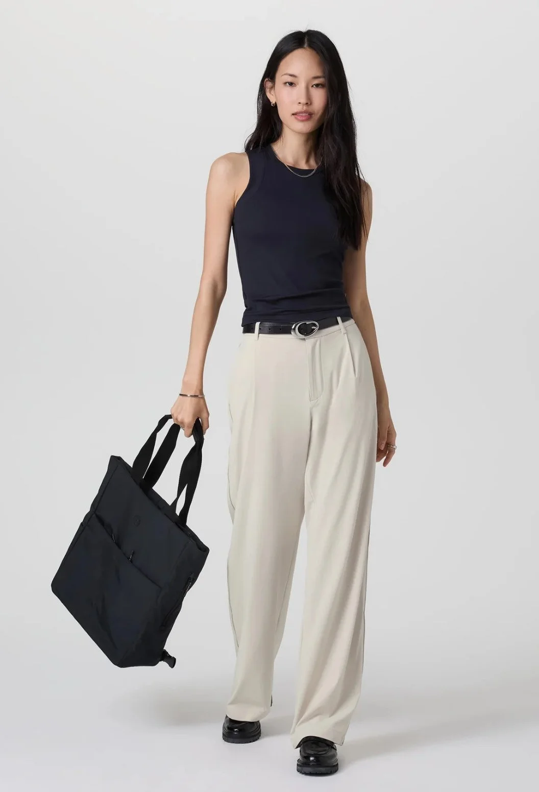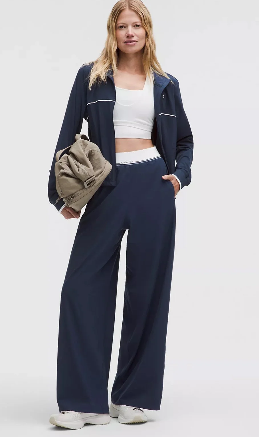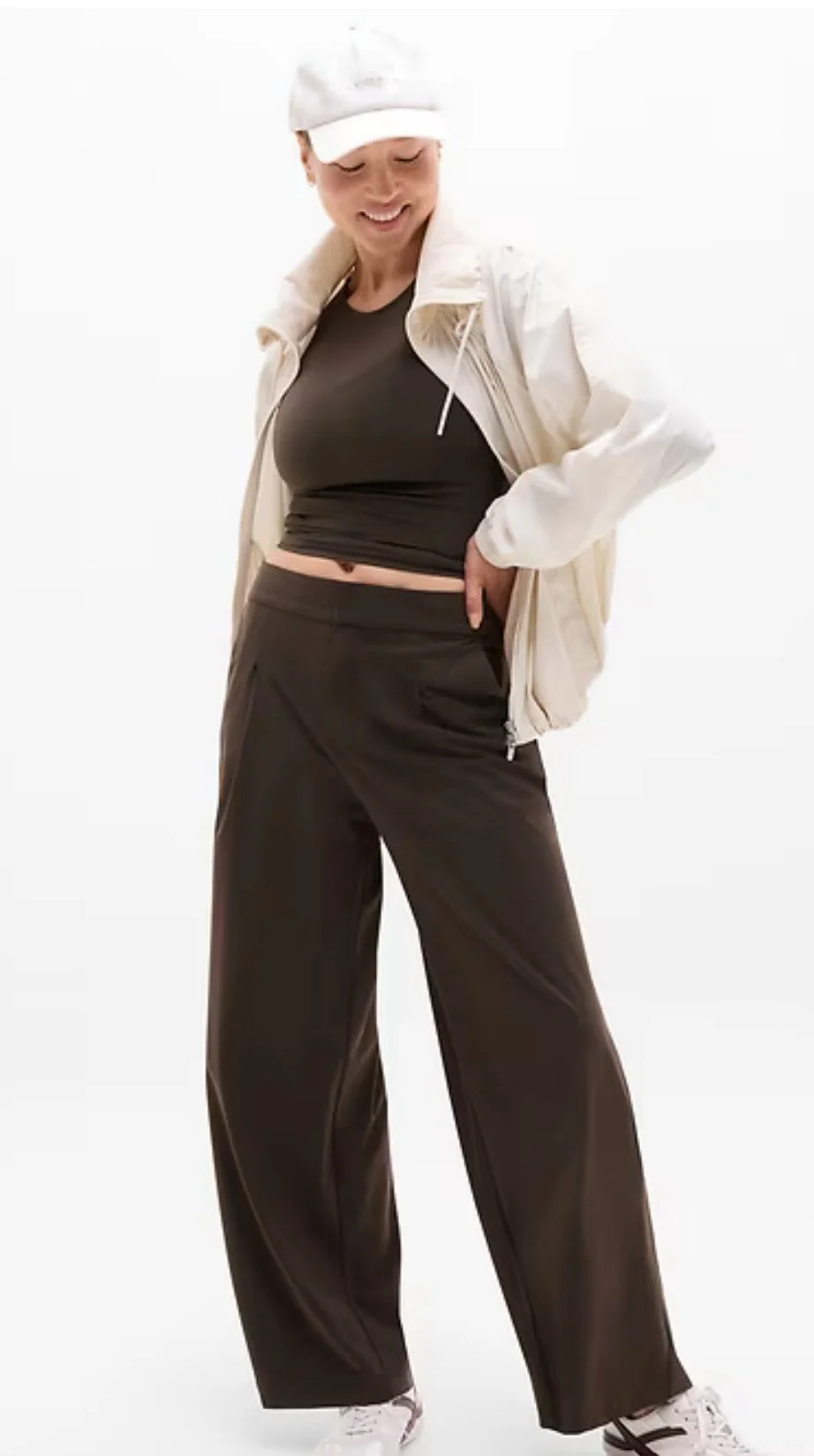 A similar style pant but one with a sportier flair is the Swift High Rise Wide-Leg Pant Logo Waistband from Lululemon or the Suit Up Trouser from Alo. This is a more athletic looking pant because of the elastic logo waistband.