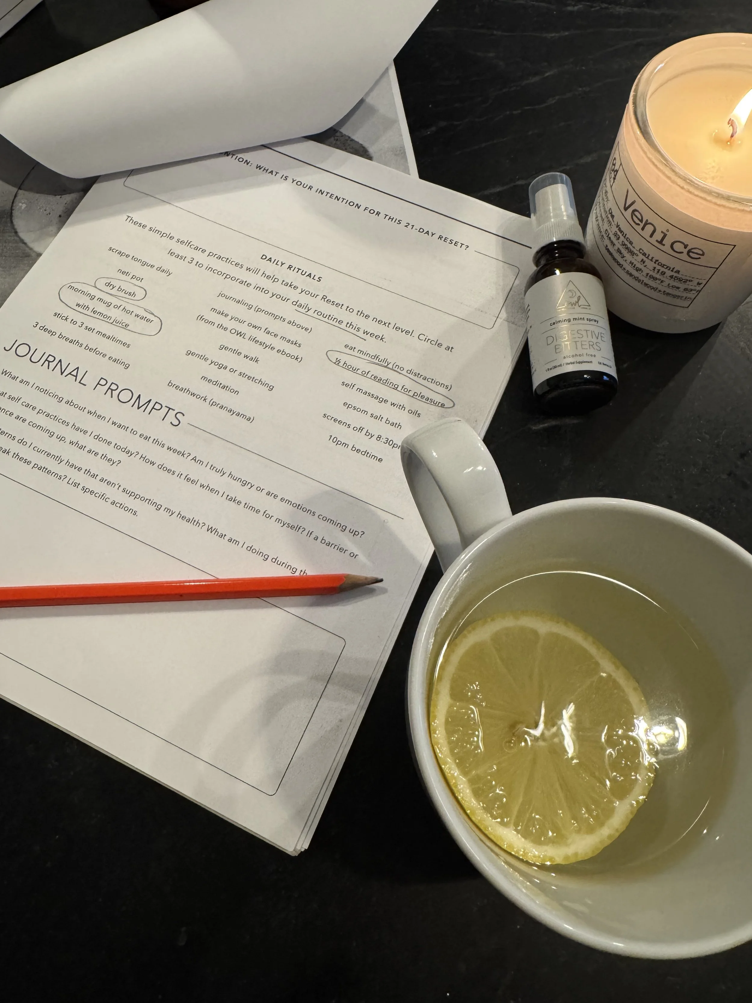 The 21 Day Reset invites you to pick at least three rituals to incorporate into your day, every day, for all 21 days. While I had high hopes of dry brushing and gua sha, my busy mornings filled with getting three kids off to school didn’t make these rituals realistic for me. But I did find some daily rituals that were totally doable and that I actually really enjoyed. They are 1) digestive bitters before meals, 2) enjoying a cup of hot lemon water before anything else in the morning, and 3) replacing doom scrolling before bed with a book. These are all simple practices that I plan to make part of my daily routine after the 21 days.