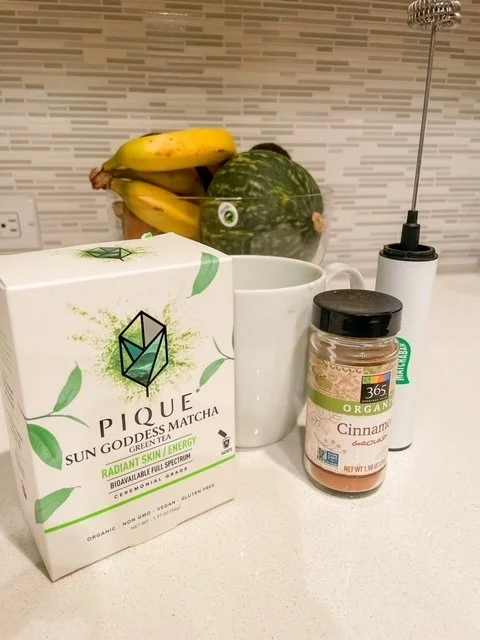 Tons of people on IG reached out with suggestions on how to prepare matcha, and I took them. I bought the Pique packets so that I don’t have to worry about how much matcha to scoop out. I pour hot (not boiling) water about 1/2 of the cup and fill about another 1/4 with oat milk. I add a small amount of sugar and some cinnamon, and stir it all up with my fancy new matcha mixer. And then I sit in the dark and make sure no one talks to me while I sip and enjoy it. So I didn’t lose my ritual. And now the good feelings of those first morning sips stay with me all day long.