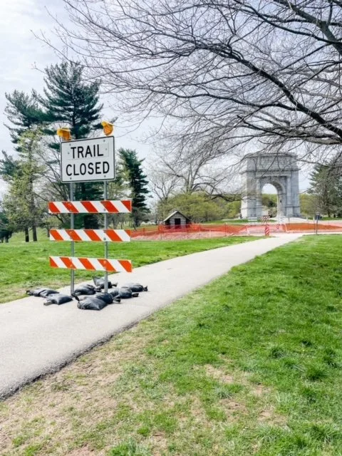 My favorite way to tour Valley Forge National Park is to go for a longer, more challenging run. The trail I typically use, and the most popular one for runners or walkers, is the Joseph Plumb Martin Trail. The “inner trail” is a five mile loop and is pretty hilly. So it never feels like the 5 miles that I do on the Radnor Trail. Almost all of the 9 free parking lots throughout the park access this trail but I typically park under the National Memorial Arch. (My regular route to this lot is currently closed for construction so be sure to check updates on the various renovation projects happening at the park this spring and summer).