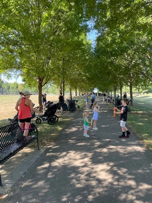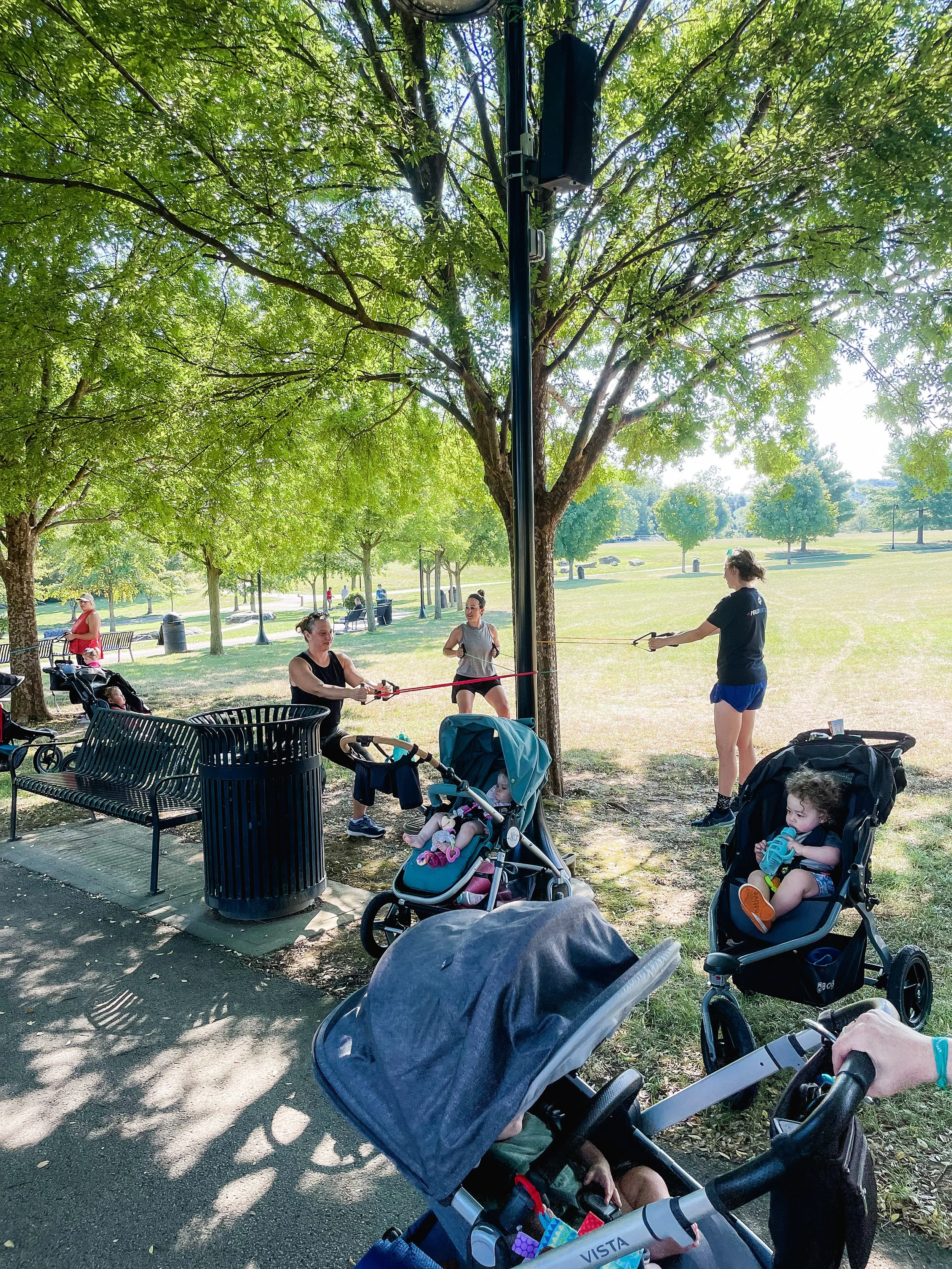 Stroller Strides is the class that I attended at Wilson Farm Park and takes place on Wednesdays at 9:30 am. This 60 minute class is a total body workout that incorporates strength, cardio and core, all while your child is in the stroller (or not!). Anna utilizes different parts of the park, which makes the workout interesting. And wherever the group goes, there is always a shady spot for the babes. Anna brings along resistance bands and the agility ladder. A yoga mat is recommended for core work and stretching at the end.