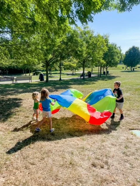 Over the summer, when Anna’s own kids were home from school, she had them entertain the toddlers who managed to wander away from the strollers during the class. This parachute always comes out mid-class, just when the kids are starting to squirm.